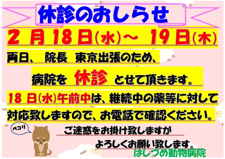 休診のおしらせ 2月 18日(水曜日) ~ 2 月 19日(木曜日・通常休診日)
